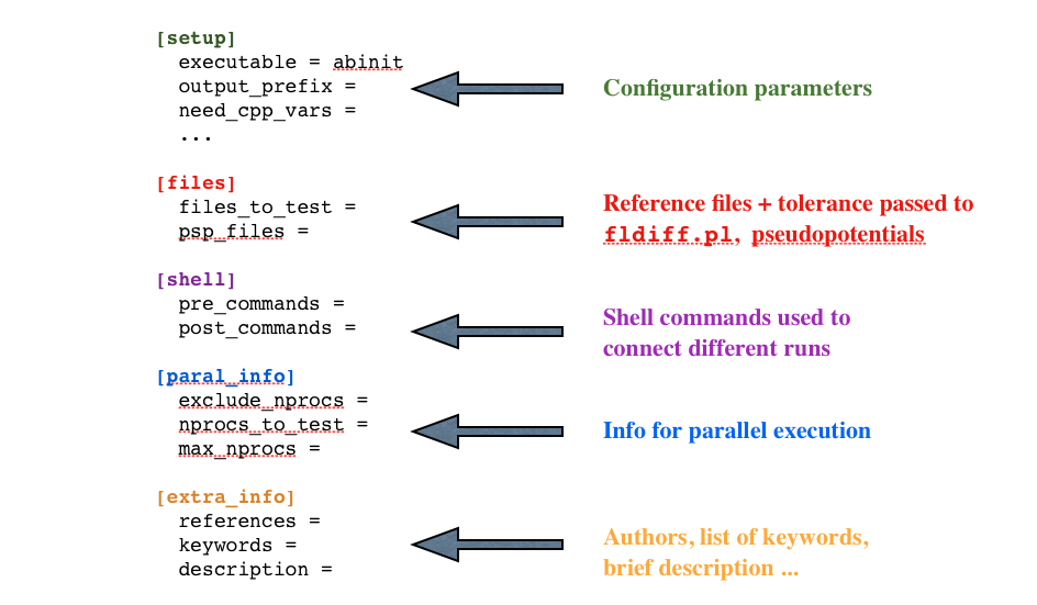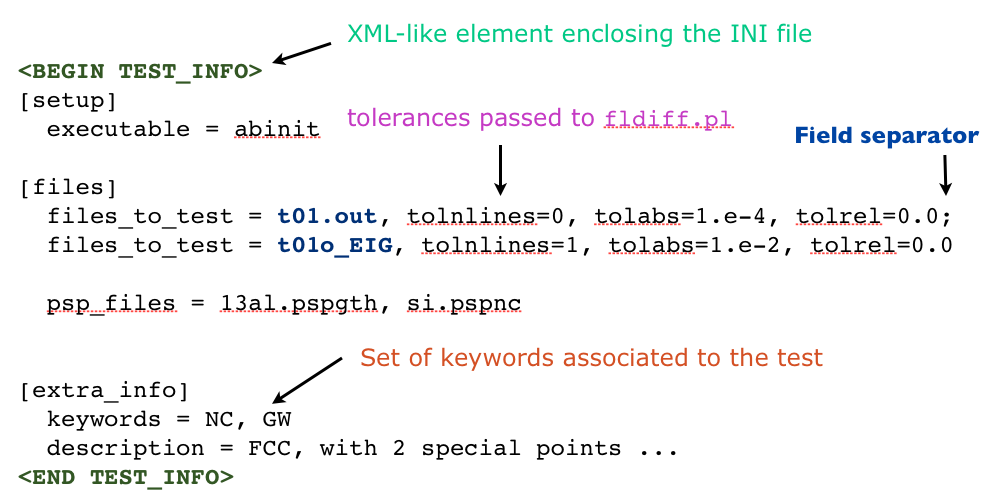 Each input file contains all the information needed to run the test and to analyze the final results. These meta-variables are gathered in the TEST_INFO section.