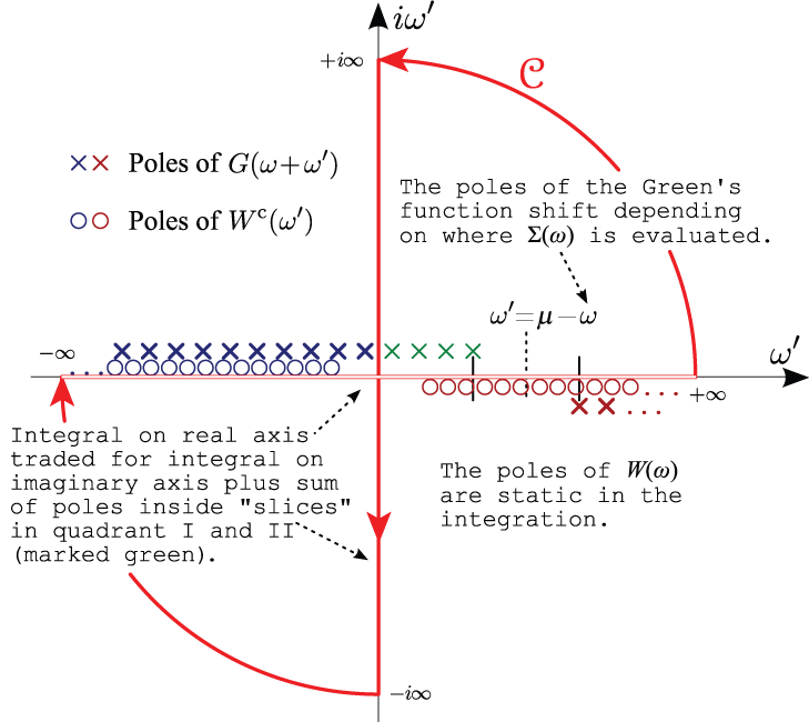 The integration along the imaginary axis is expected to converge quickly with respect to the number of sampled frequencies since the integrand is typically very smooth. Only the residues of the integrand have to be evaluated at the complex poles contributed by the Green’s function whose frequency dependence is known.