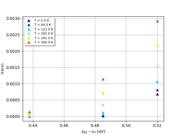 Well, the figure is not so impressive but this is normal as we are computing only 3 \kk-wavevectors still there are some points that are worth discussing. Note how the linewidths at the CBM are very small at low temperature. For the CBM, indeed, only phonon absorption is allowed and there are few vibrational states populated at low T. The linewidth at the CBM increses with T since high energy phonon states starts to be populated and more scattering channels become available.