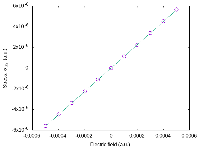 Looking at the evolution of the stress with electric field (see graphic below), you should also be able to extract the piezoelectric constants. You can try to do it as an exercise. As the calculation here was at clamped ions, you will get the clamped ion proper piezoelectric constants. You should obtain -0.6365 C/m^2. The relationships between the various response functions under conditions of strain, stress, field, and so forth are discussed in depth in [Wu2005].