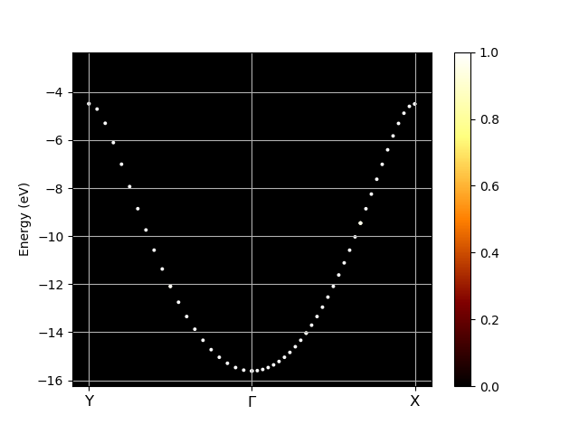 As you can see the unfolded band structure perfectly reproduces the anticipated dispersion relation E(k)=E_0 - 2A \cos(kb). We can even estimate the magnitude of the hopping matrix element between adjacent atoms V_{ssG} = -A. The band width is 4A = (-1) - (-12) = 11 eV which results in V_{ssG} = -2.75 eV.