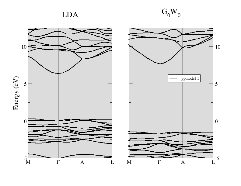 Please note that the results of these tests are not converged. A well converged calculation would require a 6x6x6 k-mesh to sample the full BZ, and a cutoff energy of 10 Ha for the screening matrix. The QP results converge extremely slowly with respect to the number of empty states. To converge the QP gaps within 0.1 eV accuracy, we had to include 1200 bands in the screening and 800 states in the calculation of the self-energy.